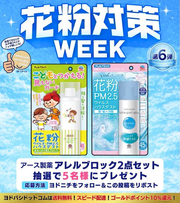 【X懸賞】アース製薬 アレルブロック2点を5名様にプレゼント 2026.02.04ヨドバシ@日用品専門‐プレゼントキャンペーン 賞品:アース製薬 アレルブロック2点(5名様) 締切:2026年2月6日(金)👉フォロー&リポスト👉憎き花粉に一言どうぞ!✍️※詳細はキャンペーンページにてご確認ください。応募はこちらから
