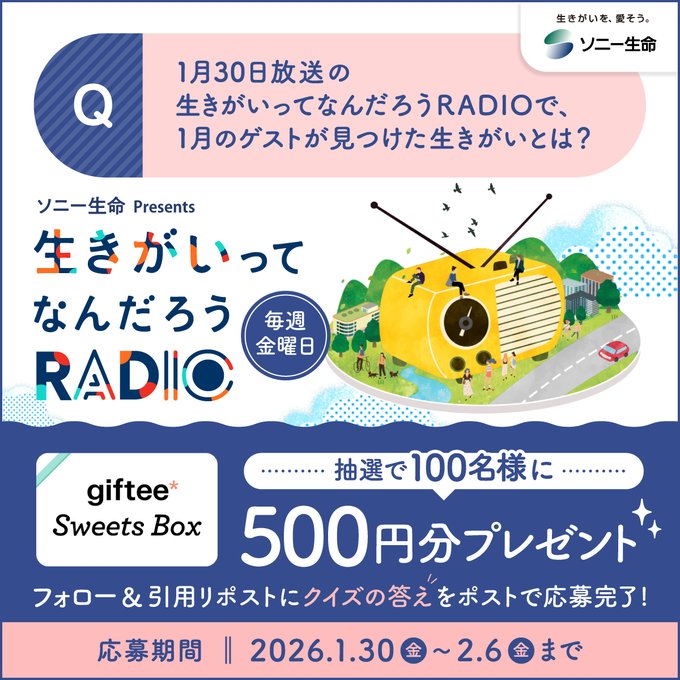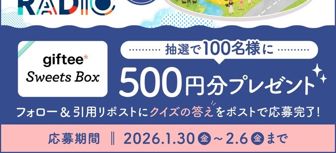 【X懸賞】giftee Sweets Box 500円分を100名様にプレゼント 2026.02.04ソニー生命保険株式会社‐プレゼントキャンペーン 賞品:giftee Sweets Box 500円分(100名様) 締切:2026年2月6日(金)応募方法 ①アカウントをフォロー ②投稿の引用RPに答えを投稿。※詳細はキャンペーンページにてご確認ください。応募はこちらから