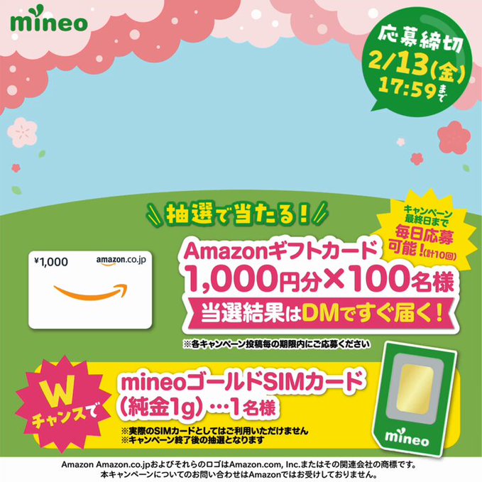Wチャンス💚 Amazonギフトカードにご応募の上 #春のマイネオ割 をつけてリプライすると1名様に純金SIMカードが当たります🏆✨