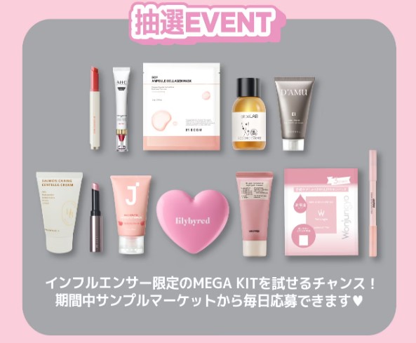 インフルエンサー限定のMEGA KITを試せるチャンス! 期間中サンプルマーケットから毎日応募できます。