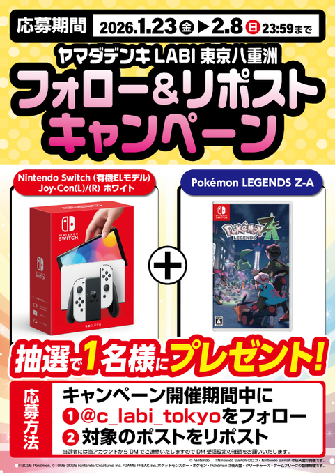 賞品:Nintendo Switch 有機ELモデル&Pokémon LEGENDS Z-A(1名様)
