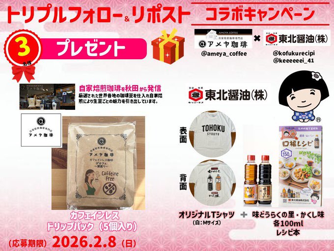 @ameya_coffee @kofukurecipi @keeeeeei_41 をフォロー&キャンペーン対象ポストをリポストしてご応募ください。