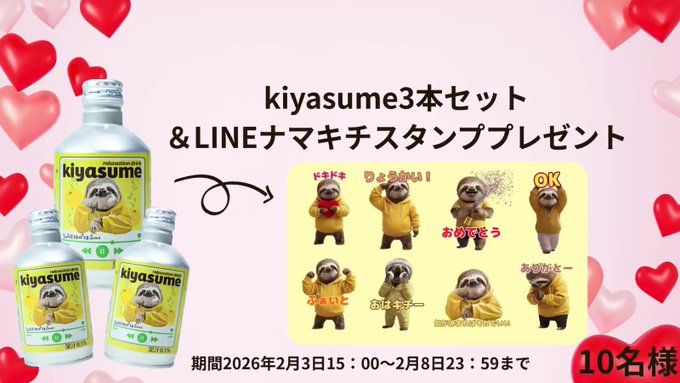 【X懸賞】kiyasume3本&LINEスタンプを10名様にプレゼント 2026.02.06ナマキチ‐バレンタインキャンペーン 賞品:kiyasume3本&LINEスタンプ(10名様) 締切:2026年2月8日(日)①@namakichi709をフォロー ②いいね&リポスト※詳細はキャンペーンページにてご確認ください。応募はこちらから