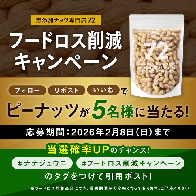 【X懸賞】ピーナッツを5名様にプレゼント 2026.02.06無添加ナッツ専門店72‐プレゼントキャンペーン 賞品:ピーナッツ(5名様) 締切:2026年2月8日(日)1️⃣@72_nanajuniをフォロー 2️⃣投稿をリポスト&いいね※詳細はキャンペーンページにてご確認ください。応募はこちらから