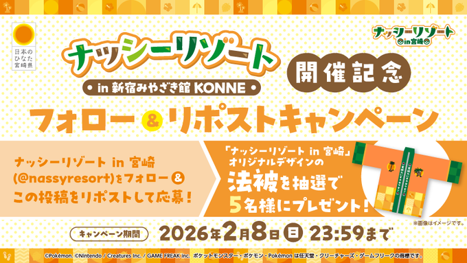 【X懸賞】ナッシーの法被を5名様にプレゼント 2026.02.06ナッシーリゾートin宮崎‐フォロー&リポストキャンペーン 賞品:ナッシーの法被(5名様) 締切:2026年2月8日(日)公式X(Twitter)アカウントをフォロー&キャンペーン対象ポストをリポストしてご応募ください。※詳細はキャンペーンページにてご確認ください。応募はこちらから