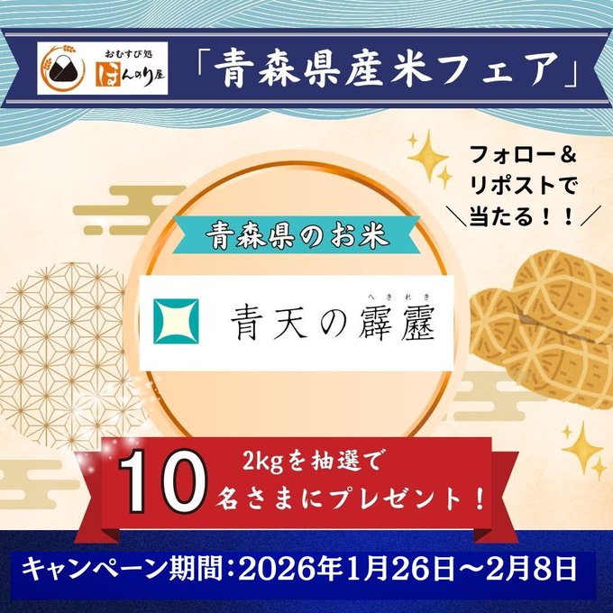賞品:青森県産米「青天の霹靂」2kg(10名様)