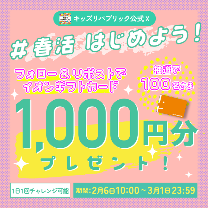 イオンの子育て応援 キッズリパブリック公式X(Twitter)アカウントをフォロー&キャンペーン対象ポストをリポストして、キャンペーンページからご応募ください。