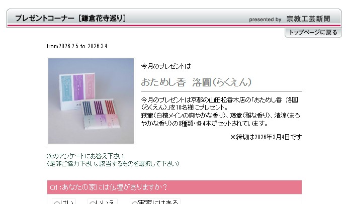 賞品:京都の山田松香木店の「おためし香 洛圓(らくえん)」(10名様)