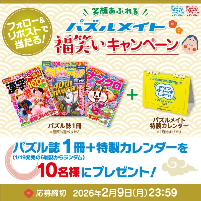 【X懸賞】パズル誌1冊+特製カレンダーを10名様にプレゼント 2026.02.07パズルメイト‐福笑い キャンペーン 賞品:パズル誌1冊+特製カレンダー(10名様) 締切:2026年2月9日(月)公式X(Twitter)アカウントをフォロー&キャンペーン対象ポストをリポストしてご応募ください。※詳細はキャンペーンページにてご確認ください。応募はこちらから