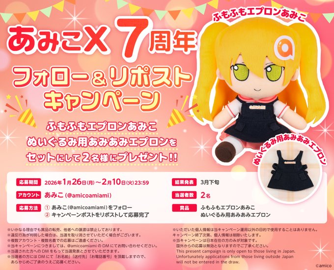 賞品:ふもふもエプロンあみこ&ぬいぐるみ用あみあみエプロン(2名様)