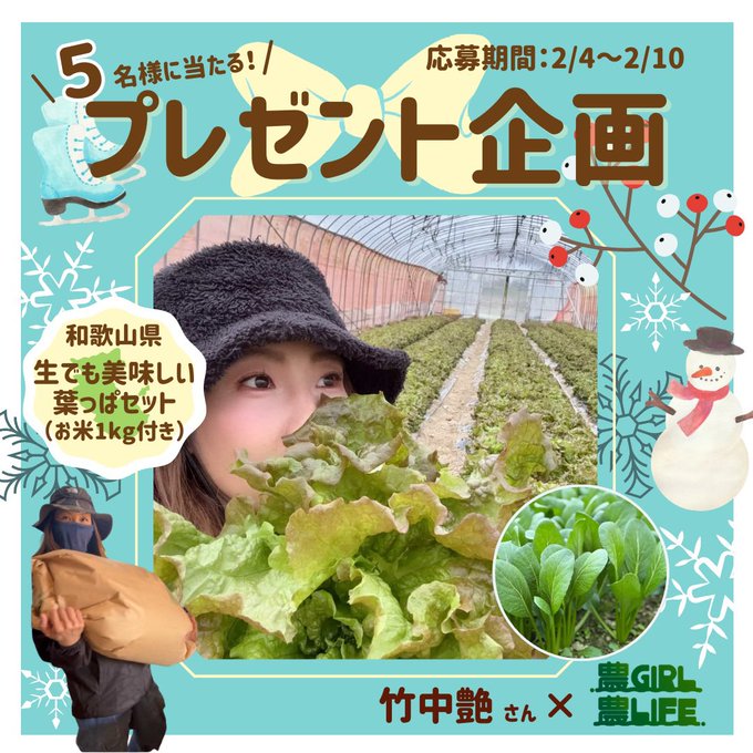 【X懸賞】生でも美味しい葉っぱセット お米(1kg)付きを5名様にプレゼント 2026.02.08農GIRL×農LIFE‐プレゼントキャンペーン 賞品:生でも美味しい葉っぱセット お米(1kg)付き(5名様) 締切:2026年2月10日(火)1️⃣@NogyoG をフォロー 2️⃣投稿を引用リツイート&コメント※詳細はキャンペーンページにてご確認ください。応募はこちらから