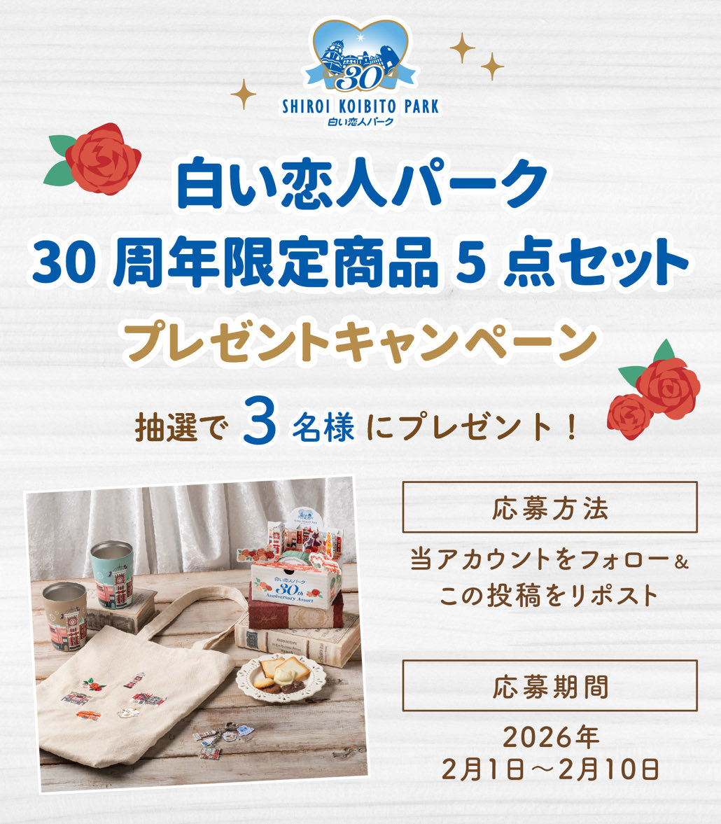【X・Instagram懸賞】白い恋人パーク30周年限定商品5点セットを3名様にプレゼント 2026.02.08白い恋人パーク‐プレゼントキャンペーン 賞品:白い恋人パーク30周年限定商品5点セット(3名様) 締切:2026年2月10日(火)公式X(Twitter)アカウントをフォロー&キャンペーン対象ポストをリポストしてご応募ください。Instagramからも応募できます。※詳細はキャンペーンページにてご確認ください。応募はこちらから