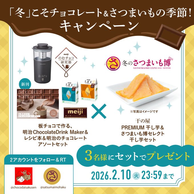 賞品:チョコレートドリンクメーカー・レシピ本・明治のチョコレートアソートセット&さつまいも博セレクト干し芋セット(3名様)
