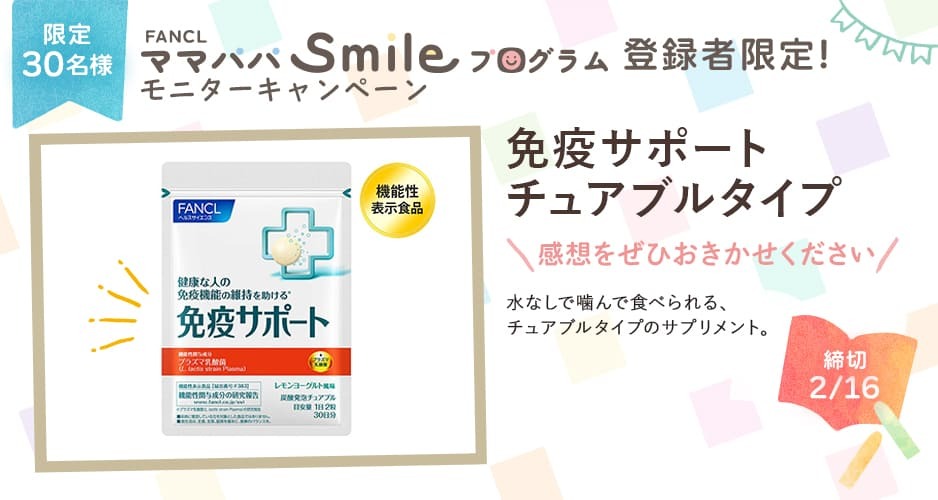 免疫サポート チュアブルタイプを30名様にプレゼント 2026.02.08ファンケル ママパパsmileプログラム登録者限定!免疫サポート チュアブルタイプ無料モニター募集 賞品:免疫サポート チュアブルタイプ(30名様) 締切:2026年2月16日(月)ご応募には会員登録/ログインが必要です。※詳細はキャンペーンページにてご確認ください。応募はこちらから