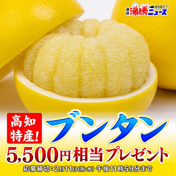 【X懸賞】高知特産ブンタン5,500円相当を3名様にプレゼント 2026.02.09旬感LIVEとれたてっ!‐フォロー&リポストキャンペーン 賞品:高知特産!ブンタン 5,500円相当(3名様) 締切:2026年2月11日(水)①番組公式Xをフォロー ②投稿にリプライまたは引用リポスト※詳細はキャンペーンページにてご確認ください。応募はこちらから