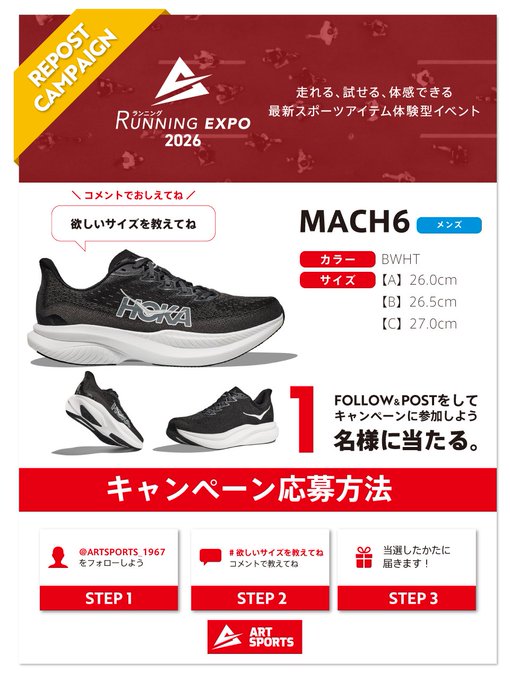 【X懸賞】HOKA MACH6を1名様にプレゼント 2026.02.10アートスポーツ‐プレゼントキャンペーン 賞品:HOKA MACH6(1名様) 締切:2026年2月12日(木)① @ARTSPORTS_1967 をフォロー ② 欲しいサイズを教えてね※詳細はキャンペーンページにてご確認ください。応募はこちらから