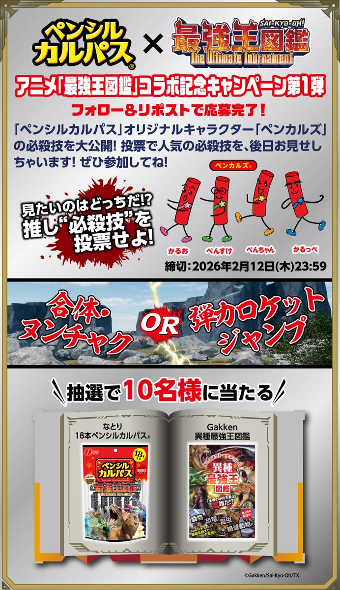 賞品:原作「異種最強王図鑑」×1冊&「18本ペンシルカルパス最強王図鑑コラボパッケージ」×1袋(10名様)
