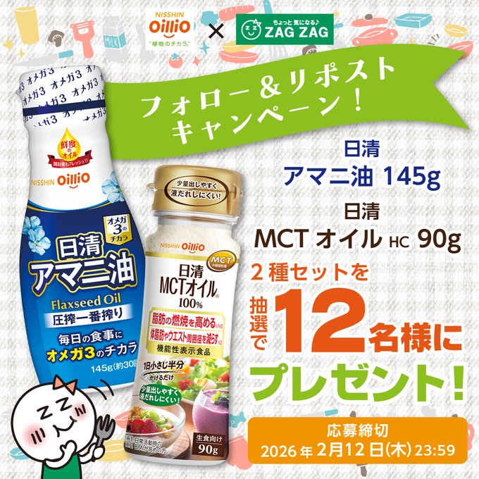 賞品:日清アマニ油&日清MCTオイル(12名様)