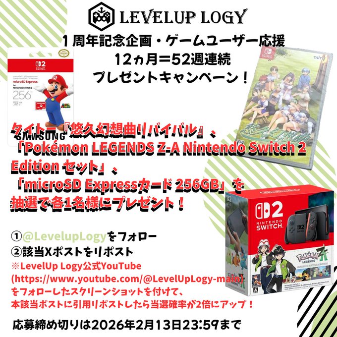 賞品:タイトー『悠久幻想曲リバイバル』(通常版パッケージ)、「Pokémon LEGENDS Z-A Nintendo Switch 2 Edition セット」、「microSD Expressカード 256GB」(合計3名様)