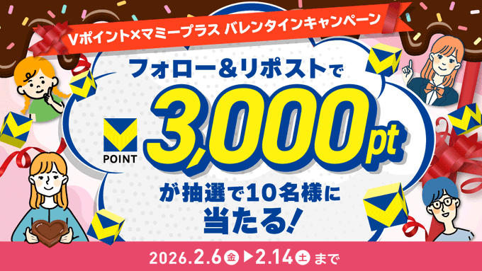 【X懸賞】Vポイント3,000ptを10名様にプレゼント 2026.02.11マミープラス‐バレンタインキャンペーン 賞品:Vポイント3000pt(10名様) 締切:2026年2月14日(土)公式X(Twitter)アカウントをフォロー&キャンペーン対象ポストをリポストしてご応募ください。※詳細はキャンペーンページにてご確認ください。応募はこちらから