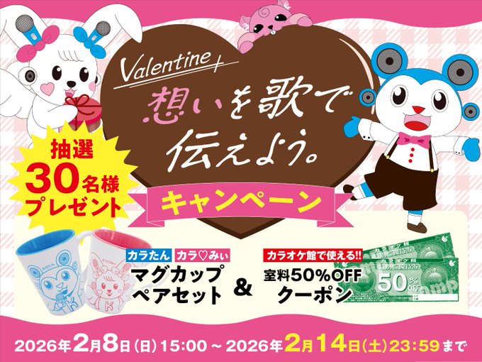 賞品:カラたん・カラ♡みぃ マグカップペアセット&カラオケ館で使える室料50%OFFクーポン券(30名様)