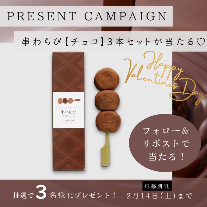 【X懸賞】串わらびチョコ3本セットを3名様にプレゼント 2026.02.11串わらび‐バレンタインキャンペーン 賞品:串わらびチョコ3本セット(3名様) 締切:2026年2月14日(土)公式X(Twitter)アカウントをフォロー&キャンペーン対象ポストをリポストしてご応募ください。※詳細はキャンペーンページにてご確認ください。応募はこちらから