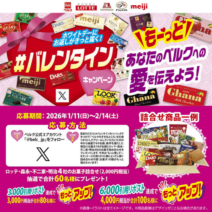ベルク公式Xアカウント(@belc_jp)をフォローのうえ、指定のポストに #バレンタイン のハッシュタグをつけてベルクの好きなところを引用リポストでアピールいただいた方の中から抽選で60名様、条件を満たした場合は最大100名様に「ロッテ・森永製菓・不二家・明治 4社のお菓子詰合せ」をプレゼント。
