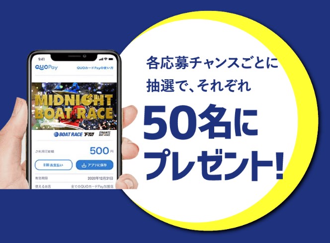 QUOカードPay1,000円分を50名様にプレゼント 2026.02.11ボートレース下関 ミッドナイト促進サイト‐プレゼントキャンペーン 賞品:QUOカードPay1,000円分(50名様) 締切:2026年2月14日(土)クイズに答えるだけ!QUOカードPay1,000円分が抽選で当たる!※詳細はキャンペーンページにてご確認ください。応募はこちらから
