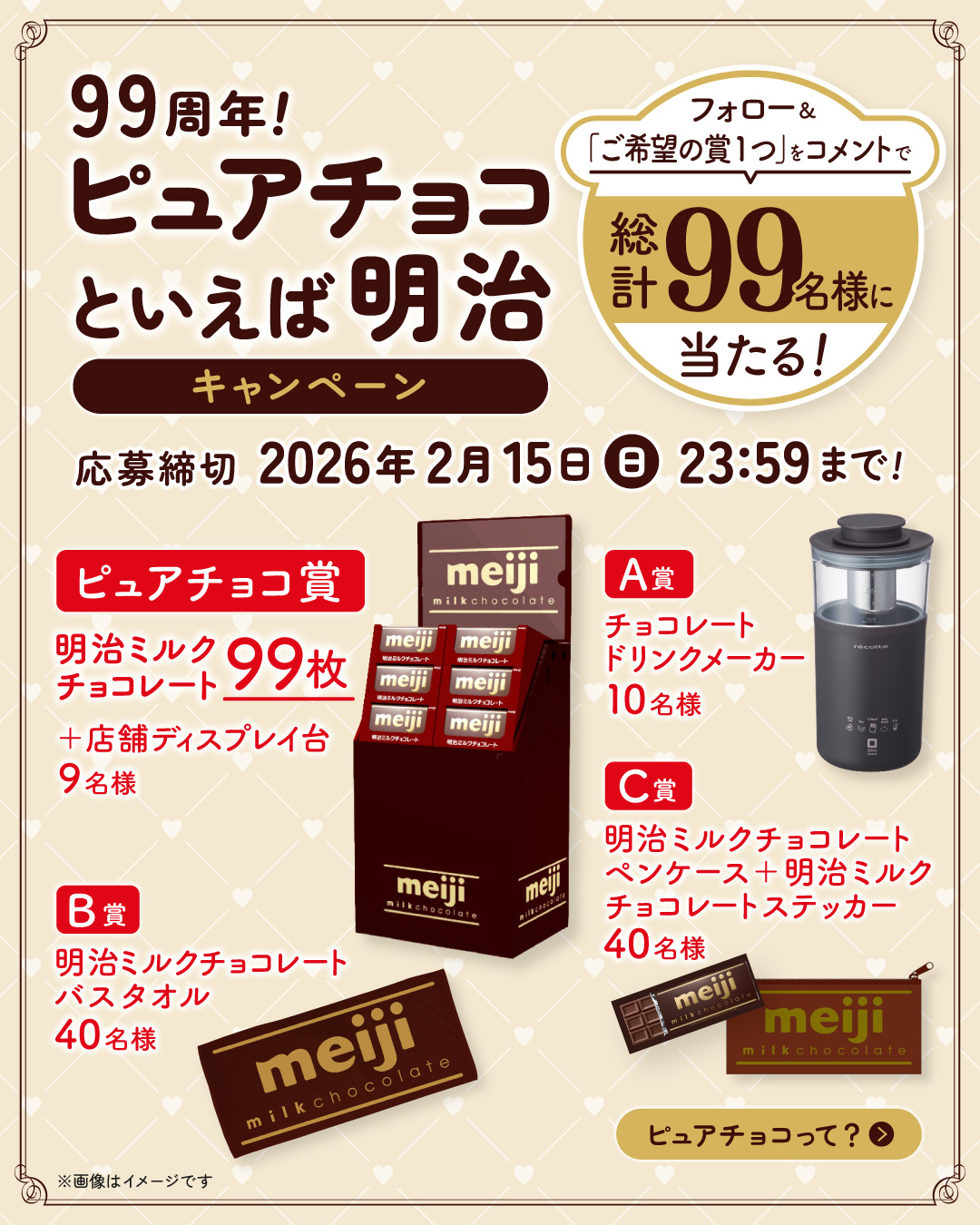【Instagram懸賞】明治ミルクチョコレートやオリジナルグッズを合計99名様にプレゼント 2026.02.12明治 おかしでHAPPY研究所‐99周年!ピュアチョコといえば明治キャンペーン 賞品:明治ミルクチョコレートやオリジナルグッズ(合計99名様) 締切:2026年2月15日(日)フォロー&「ご希望の賞1つ」をコメントで当たる※詳細はキャンペーンページにてご確認ください。応募はこちらから