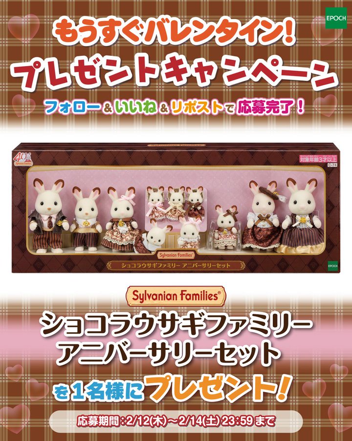 【X懸賞】シルバニアファミリー ショコラウサギファミリー アニバーサリーセットを1名様にプレゼント 2026.02.12エポック社‐プレゼントキャンペーン 賞品:シルバニアファミリー ショコラウサギファミリー アニバーサリーセット(1名様) 締切:2026年2月14日(土)アカウントをフォロー&いいね&リポストで応募完了!※詳細はキャンペーンページにてご確認ください。応募はこちらから