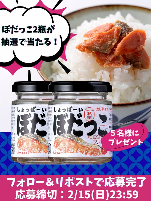 【X懸賞】ぼだっこ2瓶を5名様にプレゼント 2026.02.12UMAMY‐フォロー&リポストキャンペーン 賞品:ぼだっこ2瓶(5名様) 締切:2026年2月15日(日)公式X(Twitter)アカウントをフォロー&キャンペーン対象ポストをリポストしてご応募ください。※詳細はキャンペーンページにてご確認ください。応募はこちらから