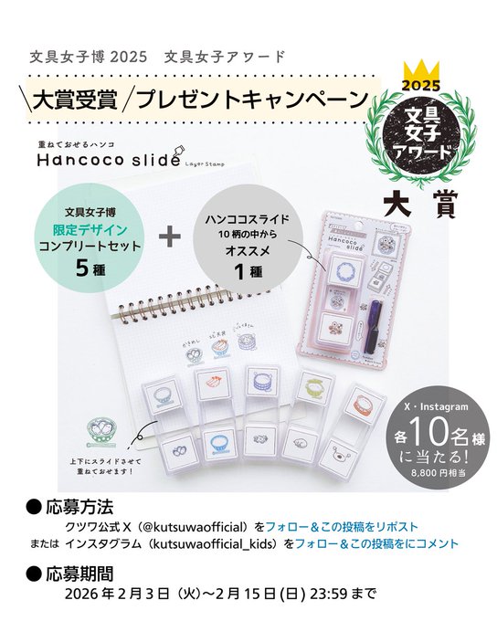 【X・Instagram懸賞】ハンココスライドを10名様にプレゼント 2026.02.12クツワ株式会社‐#ハンココスライド文具女子アワード2025・大賞受賞 プレゼントキャンペーン! 賞品:ハンココスライド(10名様) 締切:2026年2月15日(日)公式X(Twitter)アカウントをフォロー&キャンペーン対象ポストをリポストしてご応募ください。Instagramからも応募できます。※詳細はキャンペーンページにてご確認ください。応募はこちらから