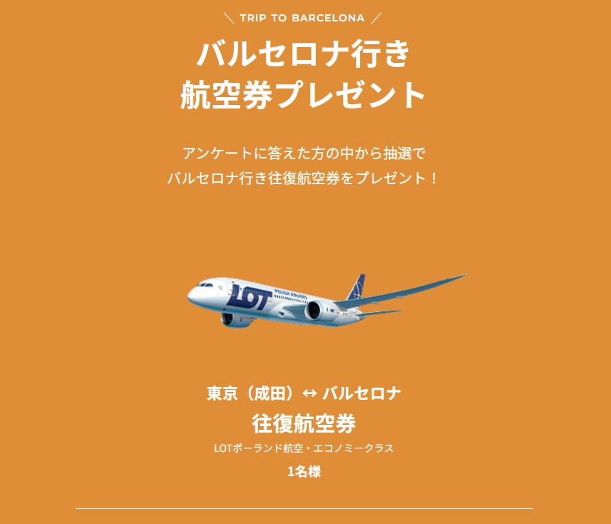 賞品:東京(成田)↔ バルセロナ往復航空券 LOTポーランド航空・エコノミークラス(1名様)