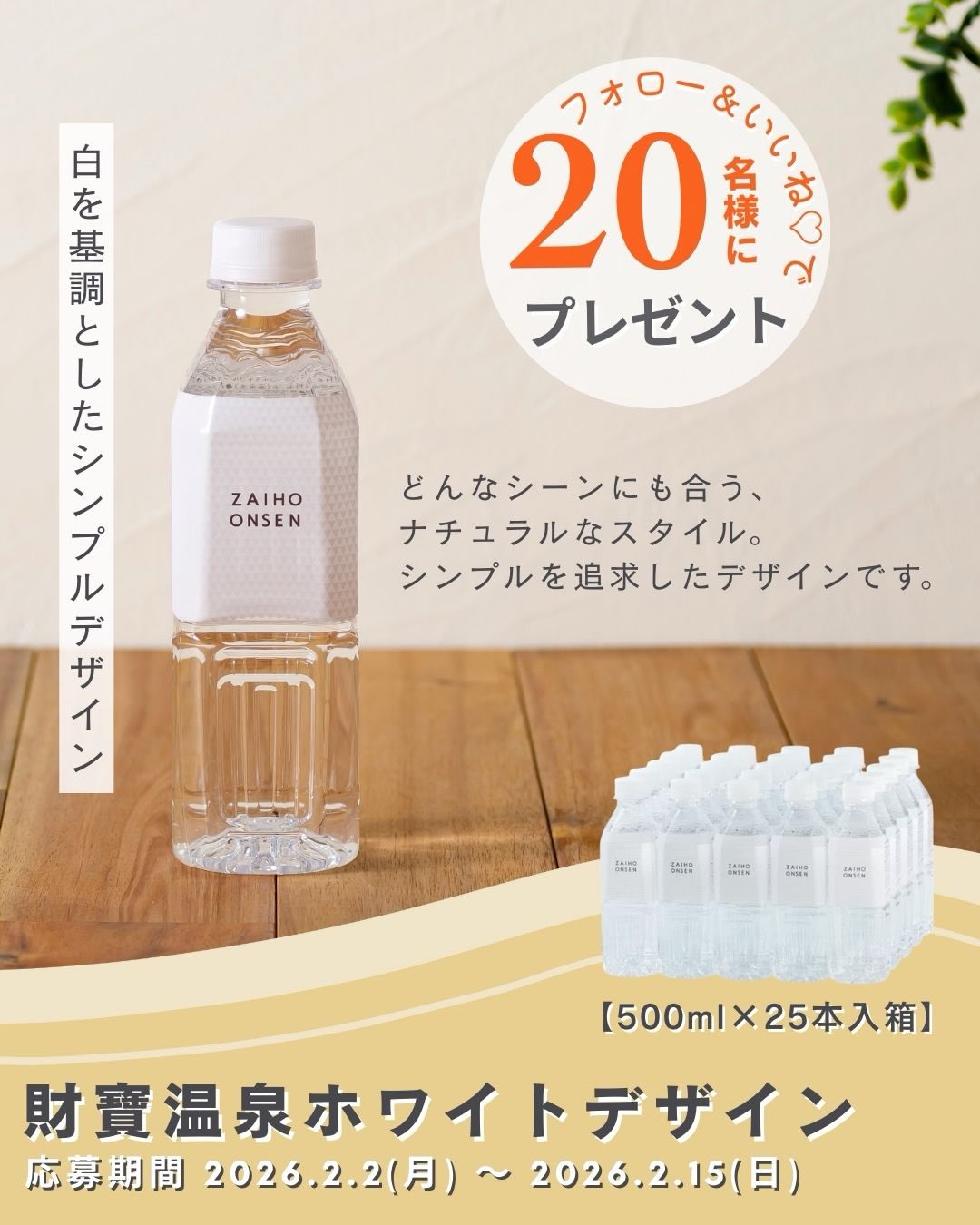賞品:財寶温泉ホワイトデザイン500mlボトル×25本入箱(20名様)