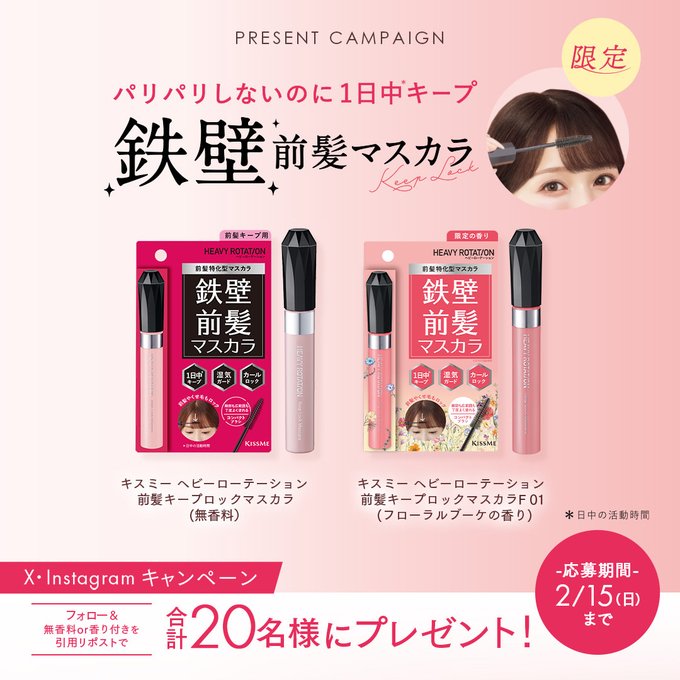 賞品:キスミー ヘビーローテーション 前髪キープロックマスカラ(無香料)、キスミー ヘビーローテーション 前髪キープロックマスカラF 01(フローラルブーケの香り)(合計20名様)