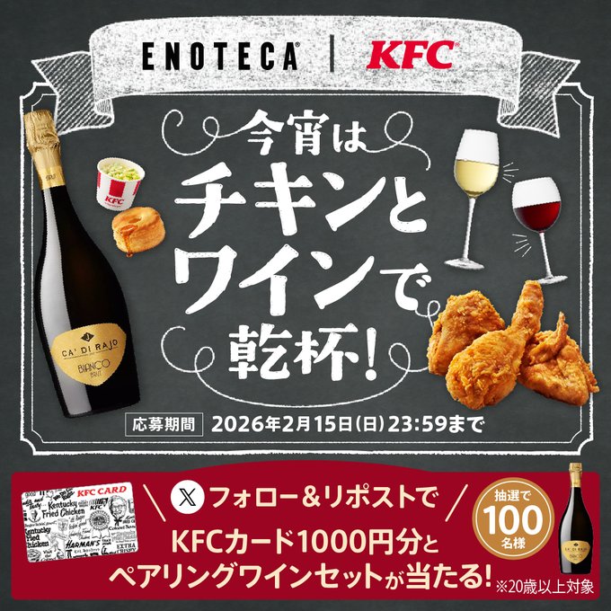 @KFC_jpと@enoteca_onlineをフォロー&キャンペーン対象ポストをリポストしてご応募ください。