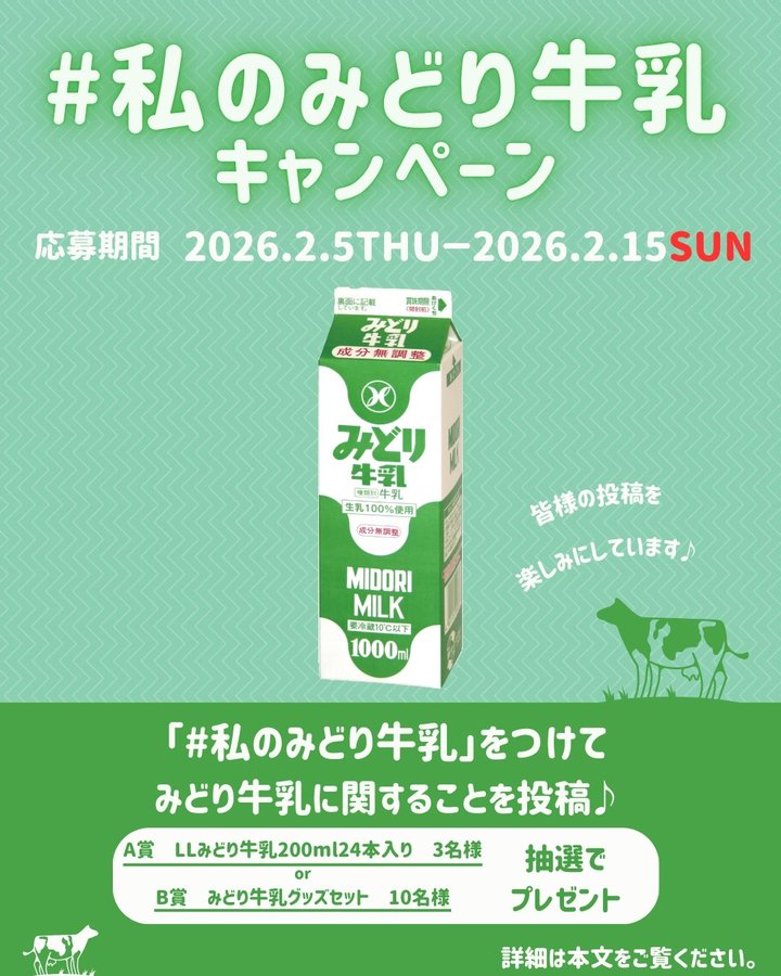 【X・Instagram懸賞】LL みどり牛乳 200ml 24本入り、みどり牛乳オリジナルグッズセットを合計13名様にプレゼント 2026.02.14九州乳業‐#私のみどり牛乳 キャンペーン 賞品: LL みどり牛乳 200ml24本入り・・・3名様 みどり牛乳オリジナルグッズセット(みどり牛乳ポーチ、ステッカー、鉛筆)・・・10名様 締切:2026年2月15日(日)公式X(Twitter)アカウントをフォロー&キャンペーン対象ポストをリポストしてご応募ください。Instagramからも応募できます。※詳細はキャンペーンページにてご確認ください。応募はこちらから