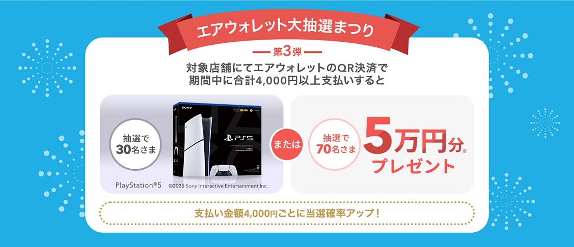 対象店舗にてエアウォレットのQR決済で4000円以上支払いすると抽選で30名さまにPlayStation®5、または70名さまに5万円をプレゼント。