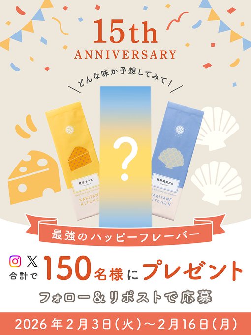 【X・Instagram懸賞】かきたねキッチン15周年記念 最強のハッピーフレーバーを150名様にプレゼント 2026.02.14かきたねキッチン‐プレゼントキャンペーン 賞品:かきたねキッチン15周年記念 最強のハッピーフレーバー(150名様) 締切:2026年2月16日(月)公式X(Twitter)アカウントをフォロー&キャンペーン対象ポストをリポストしてご応募ください。Instagramからも応募できます。※詳細はキャンペーンページにてご確認ください。応募はこちらから