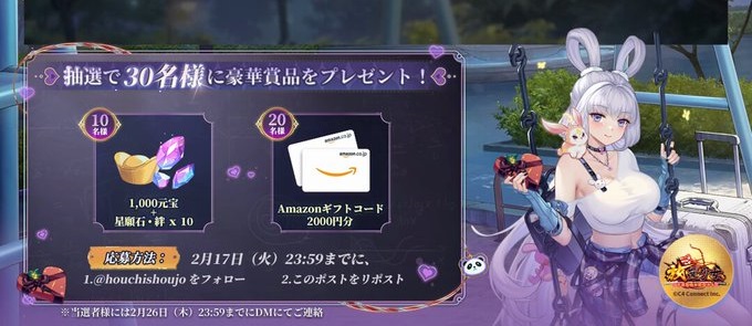 賞品:1000元宝+星願石・絆×10、Amazonギフト券2,000円分(合計30名様)