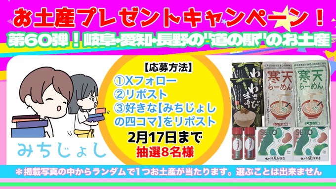 賞品:岐阜・愛知・長野の道の駅のお土産(8名様)