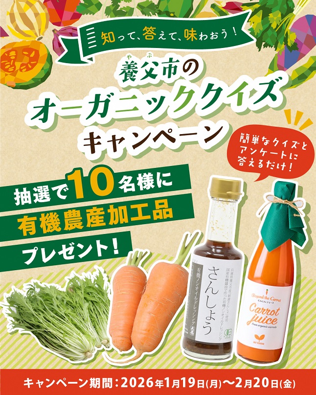 養父市産有機農産物&有機野菜の加工品を10名様にプレゼント 2026.02.15「知って、答えて、味わおう!養父市のオーガニック」キャンペーン 賞品:養父市産有機農産物、有機野菜の加工品(10名様) 締切:2026年2月20日(金)全3問のクイズに正解された方の中から抽選で、旬の有機野菜などをプレゼント。※詳細はキャンペーンページにてご確認ください。応募はこちらから