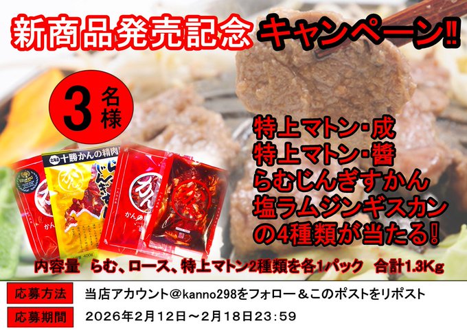 賞品:新商品の特上マトン・成と特上マトン・醤&らむじんぎすかん、塩ラムジンギスカンの合計4パック1.3kg(3名様)