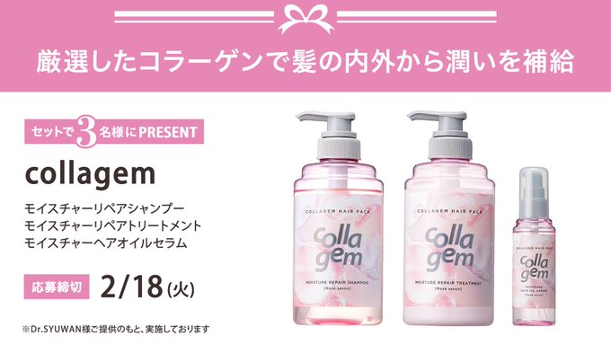 賞品:collagem モイスチャーリペアシャンプー&モイスチャーリペアトリートメント&モイスチャーヘアオイルセラム(3名様)