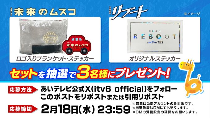 賞品:日曜劇場「リブート」オリジナルステッカー&火曜ドラマ「未来のムスコ」ロゴ入りブランケットとステッカー(3名様)