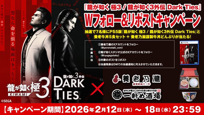 養老乃瀧グループ『龍が如く 極3 / 龍が如く3外伝 Dark Ties』Wフォロー&リポストキャンペーン