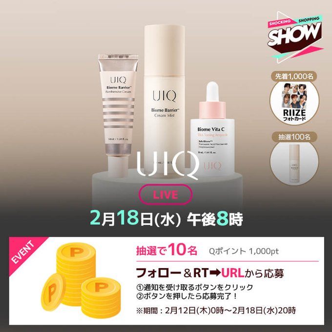 【X懸賞】Qポイント1,000ptを10名様にプレゼント 2026.02.16Qoo10‐プレゼントキャンペーン 賞品:Qポイント1,000pt(10名様) 締切:2026年2月18日(水)20:00①アカウントをフォロー&投稿をRT ②URLよりライブ通知を受け取る※詳細はキャンペーンページにてご確認ください。応募はこちらから
