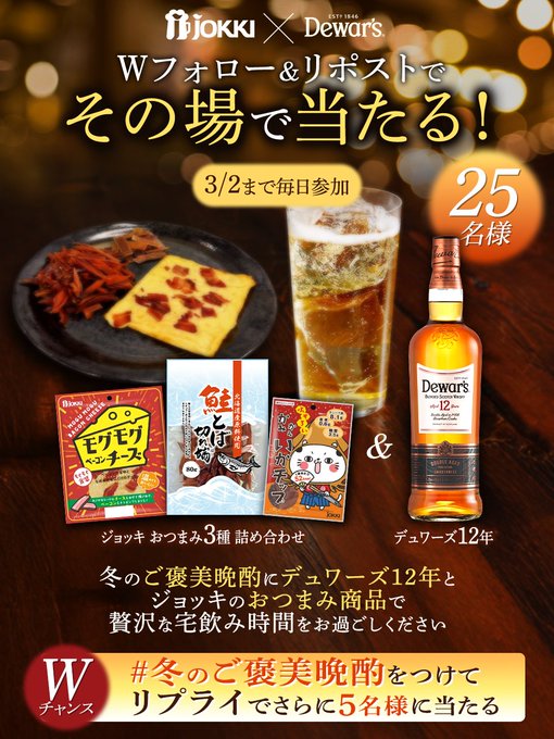 @dewars_jpnと@jokki_officialをフォロー&キャンペーン対象ポストをリポストしてご応募ください。