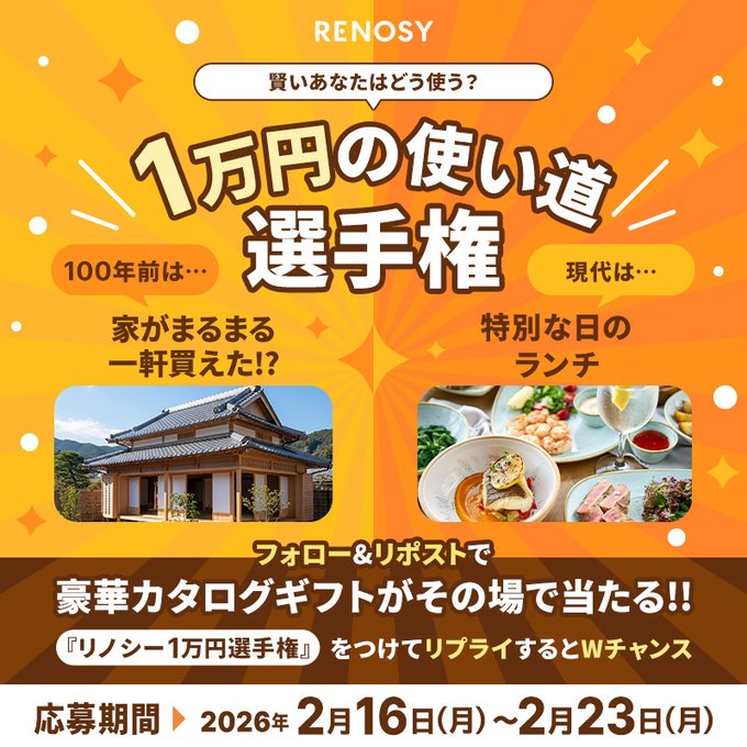 RENOSY(リノシー)公式Xアカウントをフォロー&キャンペーン対象ポストをリポストしてご応募ください。