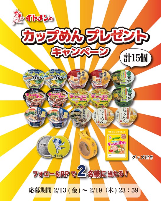 賞品:イトメンのカップめん計15個とオリジナルグッズ(2名様)